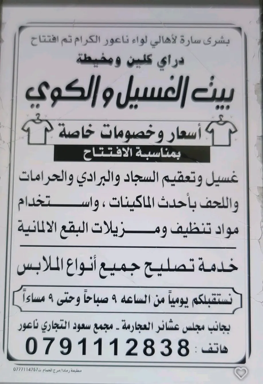 غسيل وكوي الملابس ، غسيل السجاد والحرامات والبرادي ، خياطة وتصليح الملابس